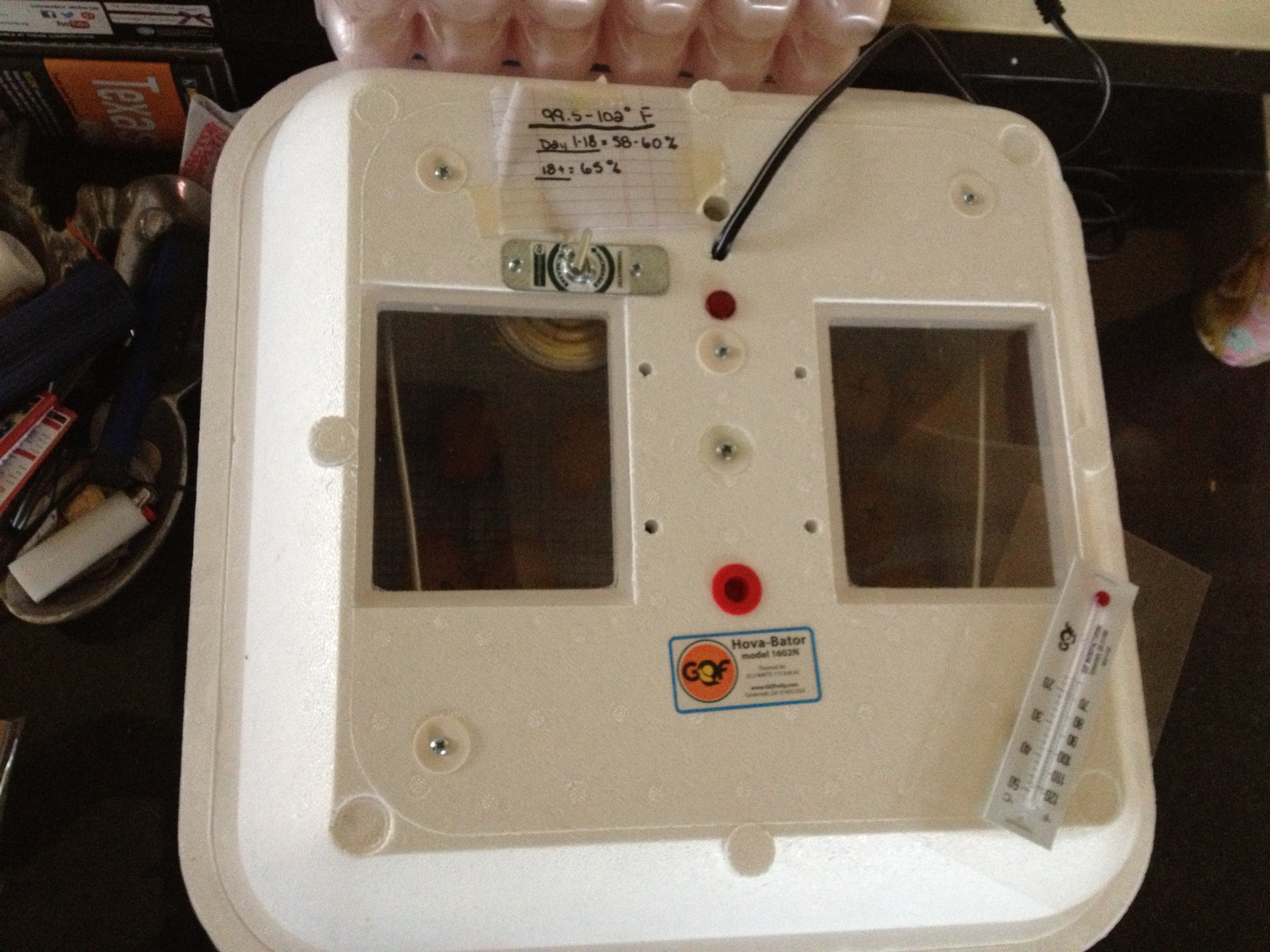 You will want to have the incubator all set up and ready to go for at least 2 days before placing eggs in there because the temperature and humidity will fluctuate until you can get it all set right. This was also a lesson learned! My temperature got up to 104 degrees the first 24 hours after I placed the eggs in there.