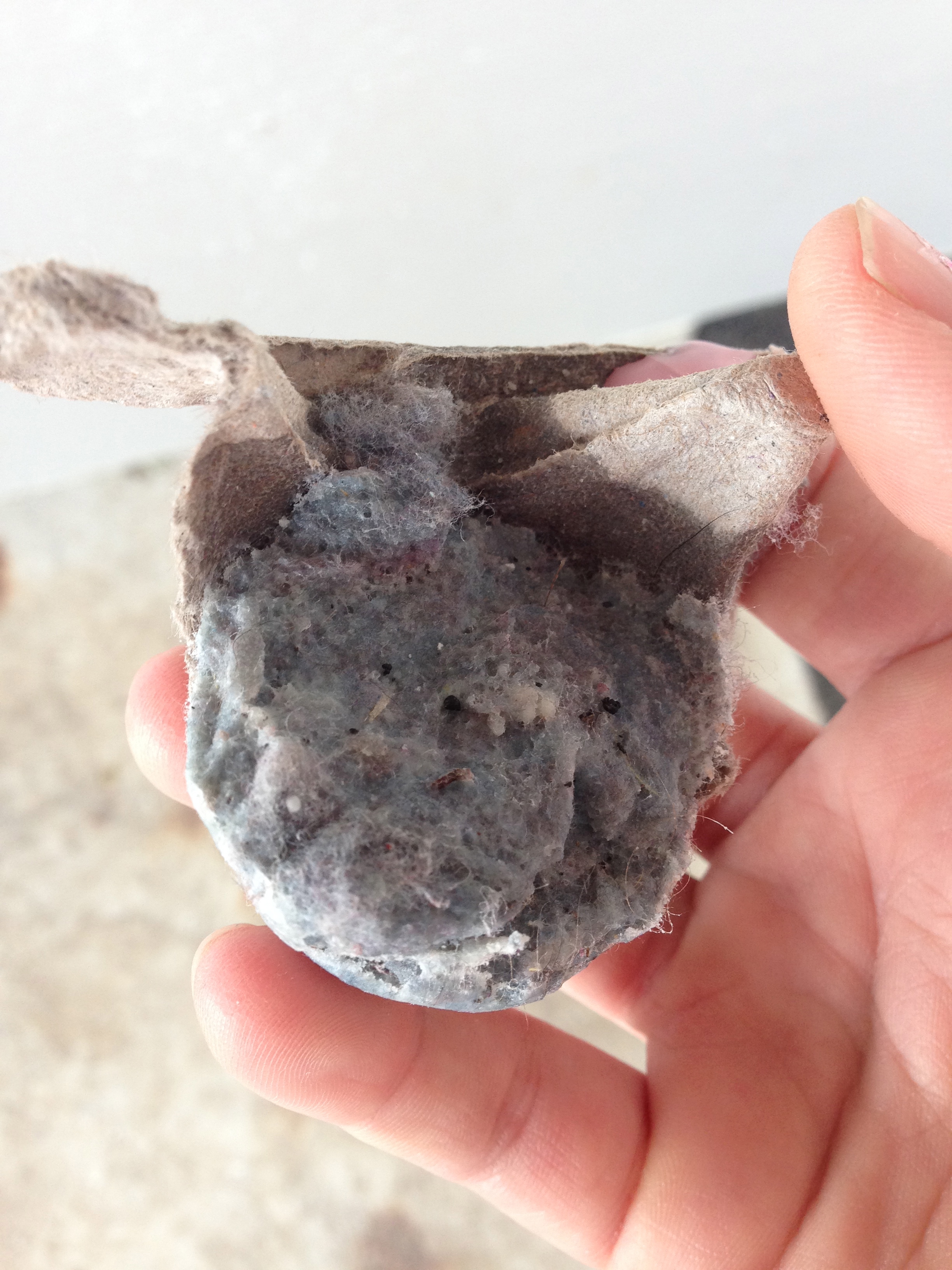 Second, you need DRYER LINT! That is right. Your trash is your treasure! You don’t need a lot. Seriously, I filled one 30 egg carton after 2 loads of laundry. But feel free to save all of your lint in a plastic bag if you want to make a bunch! Shove lint in each egg holder until it reaches the top of the carton.
