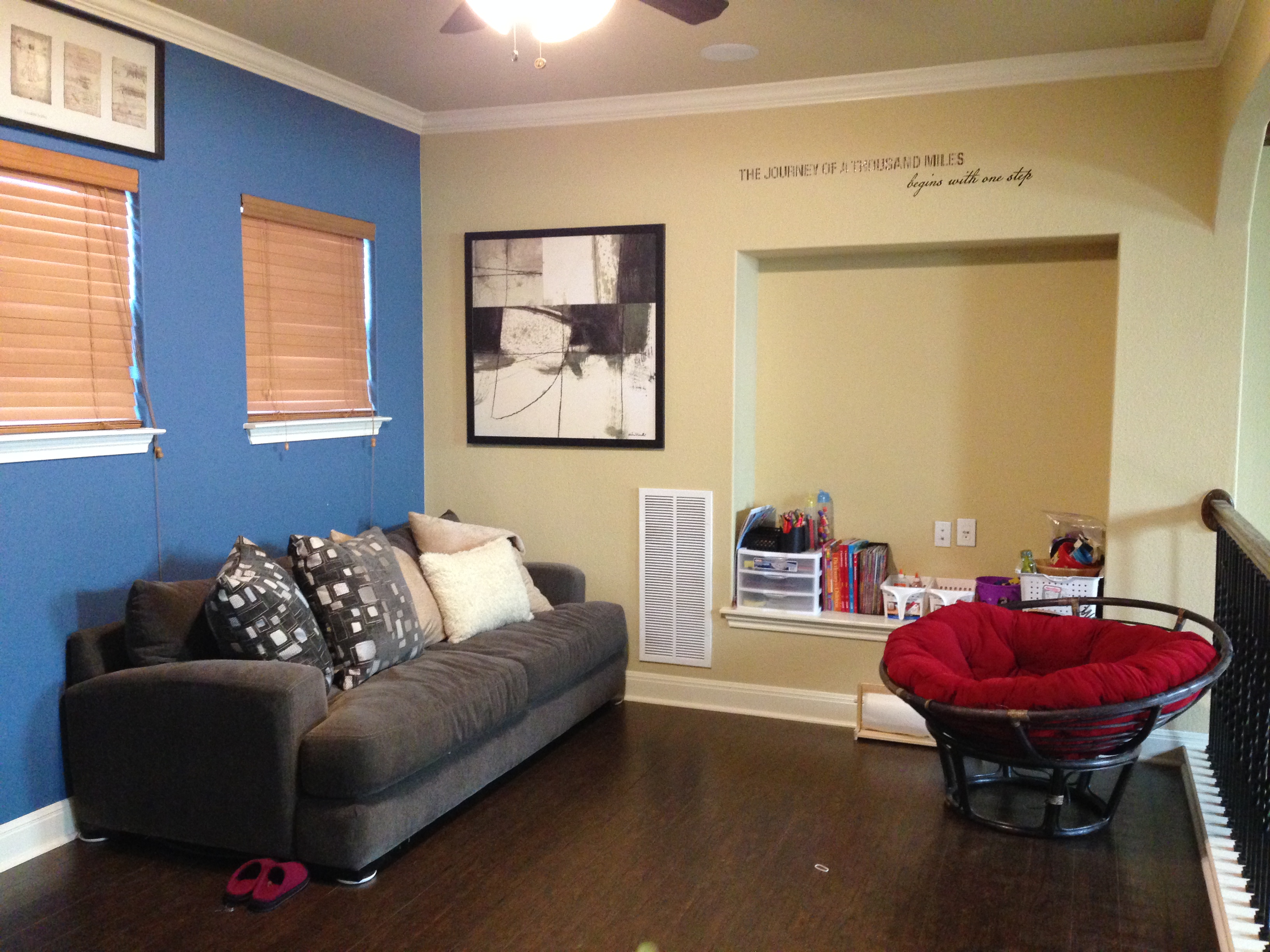Anyway, here is my mix of things I have gathered from thrift stores, goodwill book stores, walmart clearance, and other things I have found in my house to start building our classroom! We have a loft upstairs that has a couch and literally nothing else. It was going to be a movie room or game room…but really see no point and have not touched it in 2 years! I still have to add shelves where our TV bump out is, hang up a dry erase board ( I don’t have to but Mayhem, is a kinesthetic learner and I feel writing on a big board will help her out!), hang up some cool stuff, gather more supplies for curriculum, and get a table and chairs…but I have until July/August so I am acquiring things as I go. I wanted to do this the minute I was done researching..but at the same time this is an adjustment for all of us. SO I figured we would let them finish out the year, and start beginning August or late July…whenever we were ready. That is right..it is up to me!