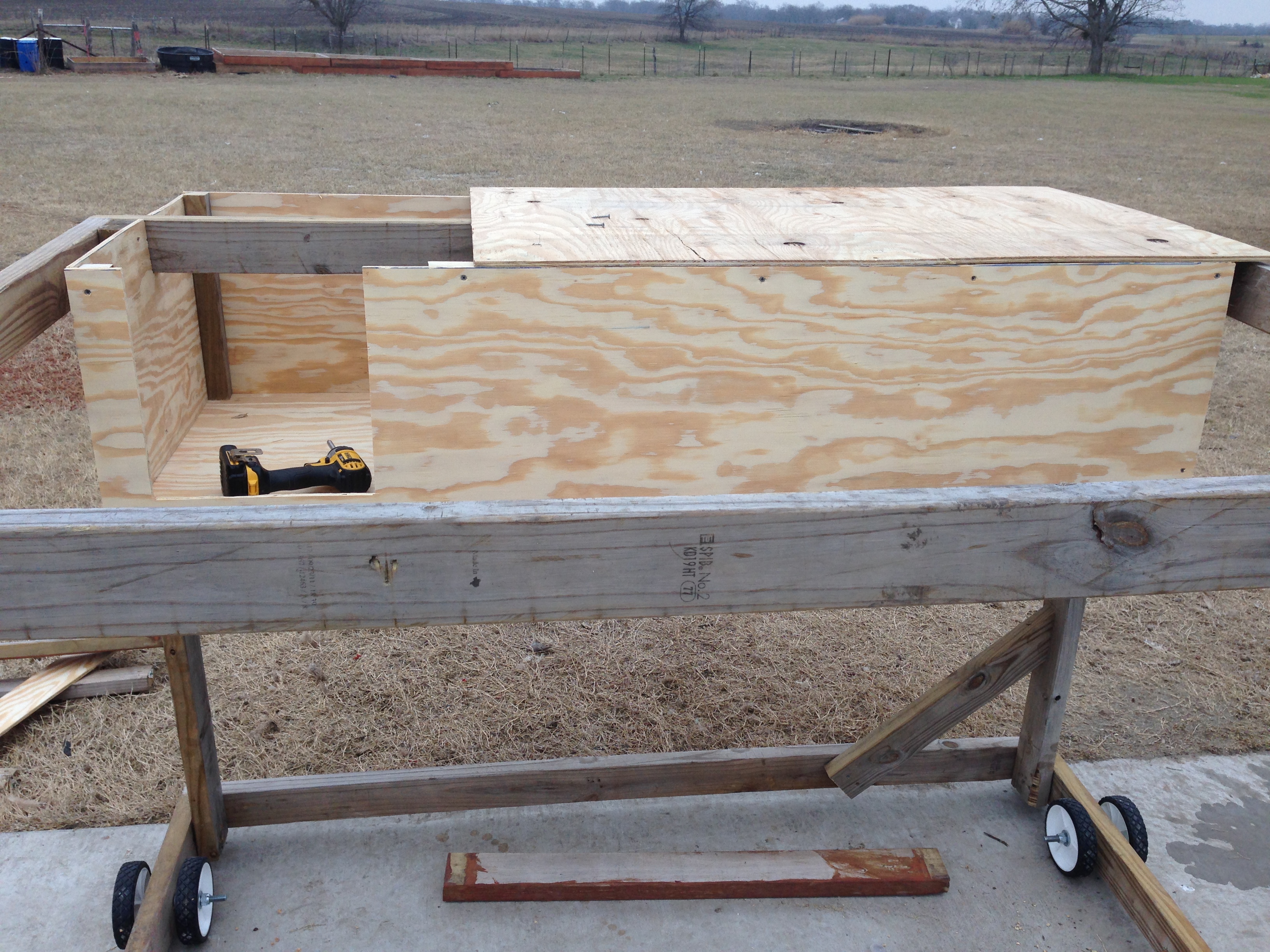 The Next Box is made out of thin plywood and small screws. We decided on a bump out, large nesting area filled with hay. I kept a lip in the front of it so hay won’t spill out. We will hinge the over hang roof into a door. We did not want to cut up another pice of plywood for the roof, so we are going to piece it together. Will have a tarp over it too so water will not get in.