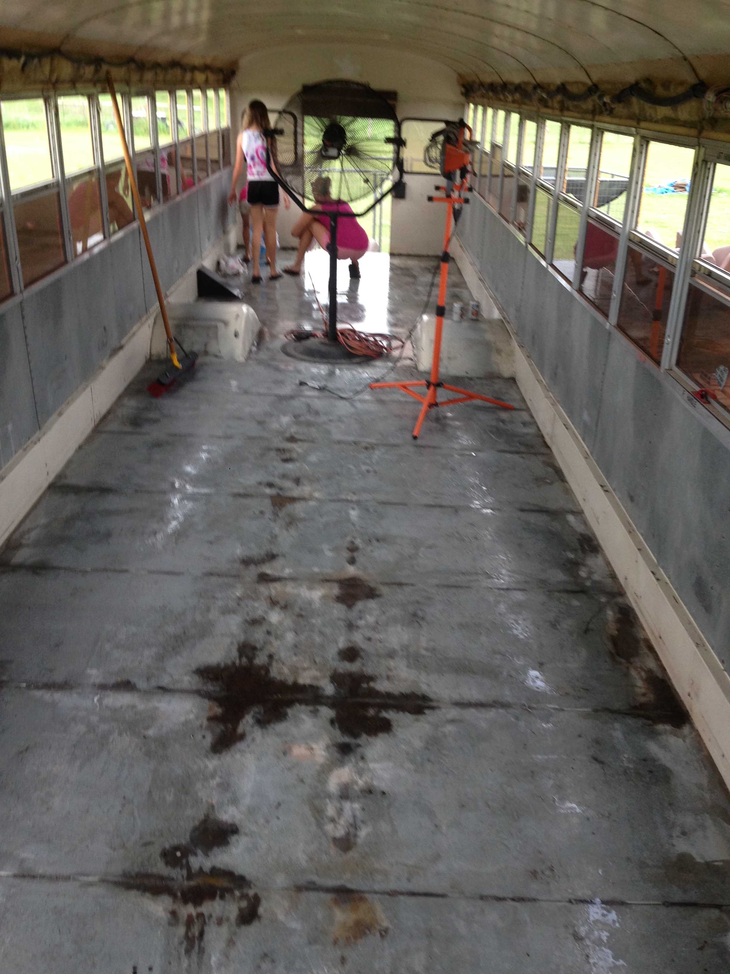 Stage 5 of Operation Chitty Bang is Sanding and Killing the Rust. We decided to take off the next two days after the night of scrubbing and the day Crab passed his driver’s test for his Class B License. Once we were restored and free of appointments, we decided to tackle the rust on the floor. We had a hand held drill with a wire brush attachment, and a bigger tool with a bigger wire brush on it. I can’t remember the name of the tool, but we also used it for grinding down the rusty nails. We definitely could have benefited from renting a sander, but we stuck with our attachments Crab just purchased to try and do it ourselves with what we had.