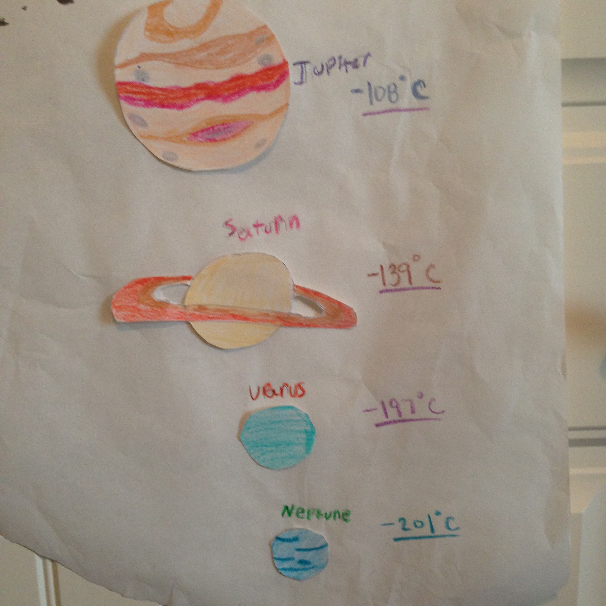 A few weeks ago, we did a lot of research on our planets, rockets, space stations, astronauts, and space in general. We watched YouTube videos, explored NASA’s website, played space games, watched movies based in space (because sci fi is always fun:)), and wrote stories/drew pictures of what it would be like to live on a space station or mars! This project really encumbered most of the subjects we talk about, if not all. We used math, writing, science, computer skills, research skills, art, and like SpongeBob says I-Mag-I-Na-Tion! Here is the biggest project we completed: