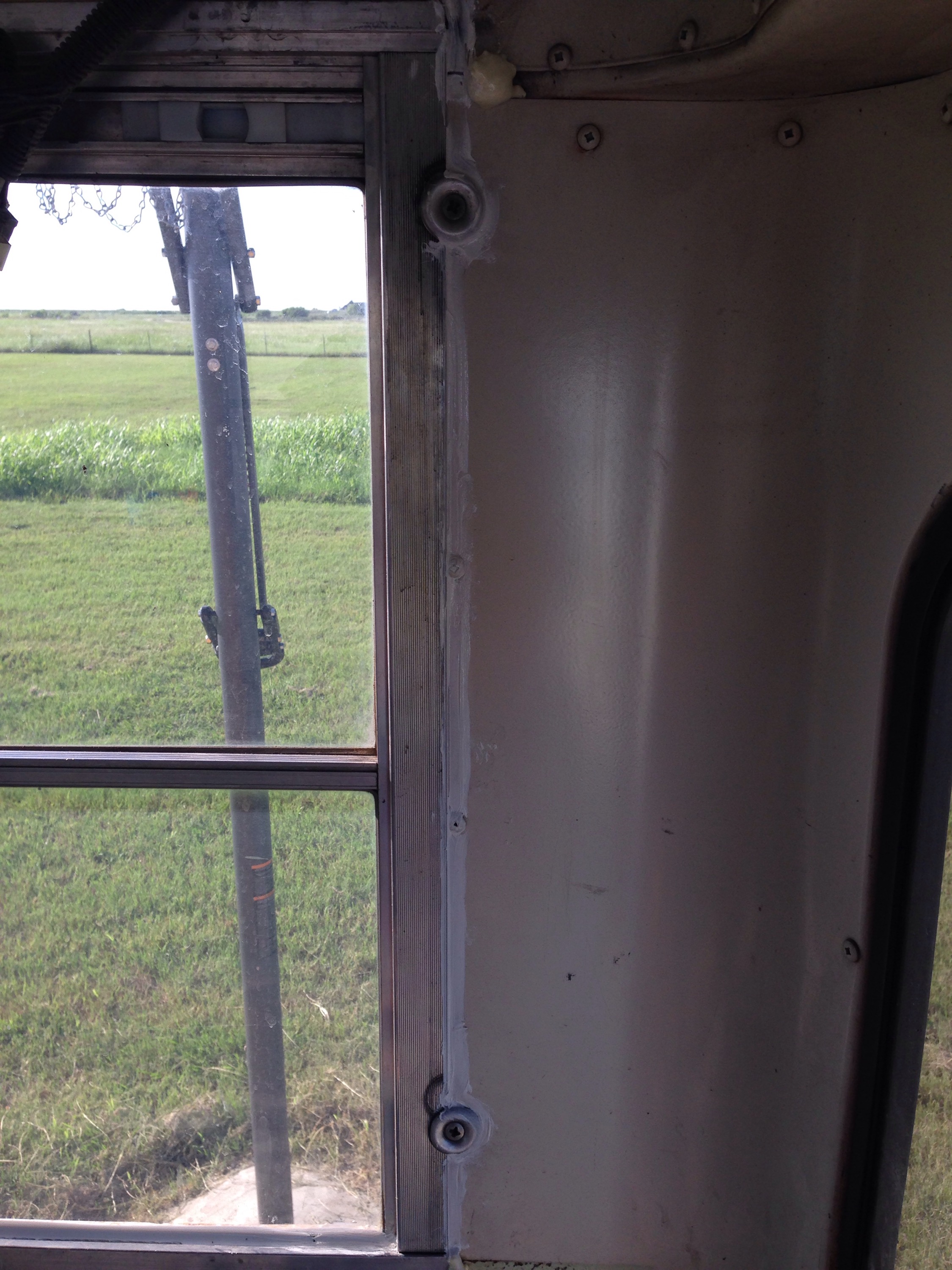 After this, we waited a few days and used the hose to spray all over the bus. No leaks! But, then it rained really really hard one day and I ran out into the bus to make sure (who can recreate mother nature, really?) and *GASP* a few leaks! But they were only around the Emergency Windows (those are total crap anyway and will be covered inside and out with aluminum anyway). SO I just sealed every single crack on them, and problem solved! I did not even have any roof leaks this time! The only leak we have left is coming from the back door, and that is just as easy as replacing the rubber seal around the door. I have been told by my Skoolie thread on Facebook that I can get that stuff anywhere. So that will be next. Then we think we may just go ahead and cover the outside of the emergency windows with the aluminum b/c we have the rivot gun for it, we just need to get the rivots and sheet of metal.