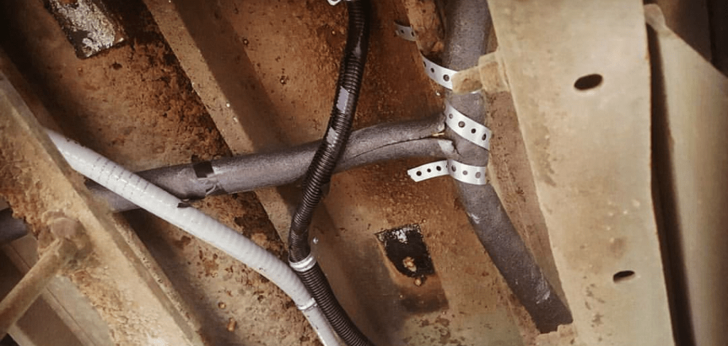 When it came to installing the drain lines, again, this was something never done before. We read the lines should hang at a 1/4″ slant all the way to the end. This lets gravity do its job. So we used some of these awesome metal straps with holes in them (we used these for lots of stuff and hanging things) to hang the 1″ PVC from the sink drain under the bus to the shower, all the way to the rear of the bus to the Gray water tank we installed at a later time while on the road (that will be in the future drain line article).