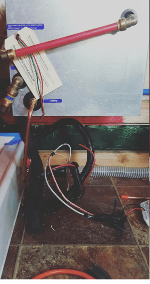 We ran copper piping from the propane cage we built underneath the bus up through the floor underneath the water heater. Underneath the bus, right underneath the water heater, we “T”ed a connection to also connect the RV refrigerator to propane since we bought a 2 way by Norcold (info on that in a future article) and it was just a few feet away on the same side of the bus.