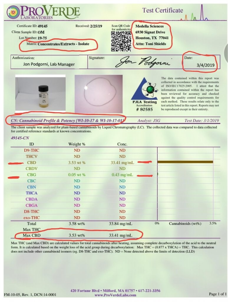 Certificate of Analysis Sent is for Medella Sciences for their Concentrates/Extracts- ISOLATE, not their tincture I requested, and States: