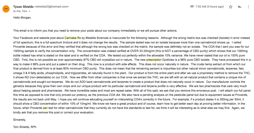 *Email reply from a person from Medella Science, and they also CCed a person at Perry Pharmacy in the email: Sent me a COA on the CBD potency, but do NOT have FULL PANELS right now!!