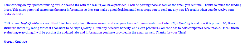 I originally gave them a 2 star rating because of their lack of testing on the pesticides, heavy metals, microbials, and residual solvents. They have since gotten testing done on all but pesticides due to lab equipment at 3rd party lab not working (per the email). I have updated their rank on the tests they provided me with.HOWEVER, after the threats, intimidation, and unprofessionalism the new calculated 3 star was dropped to 2 stars. I clearly state below my posts that I am not a doctor and the opinions are my own. And that ANY company can reach out with updated info and I would update it accordingly. This is not meant to attack anyone, it is simply to hold companies accountable.