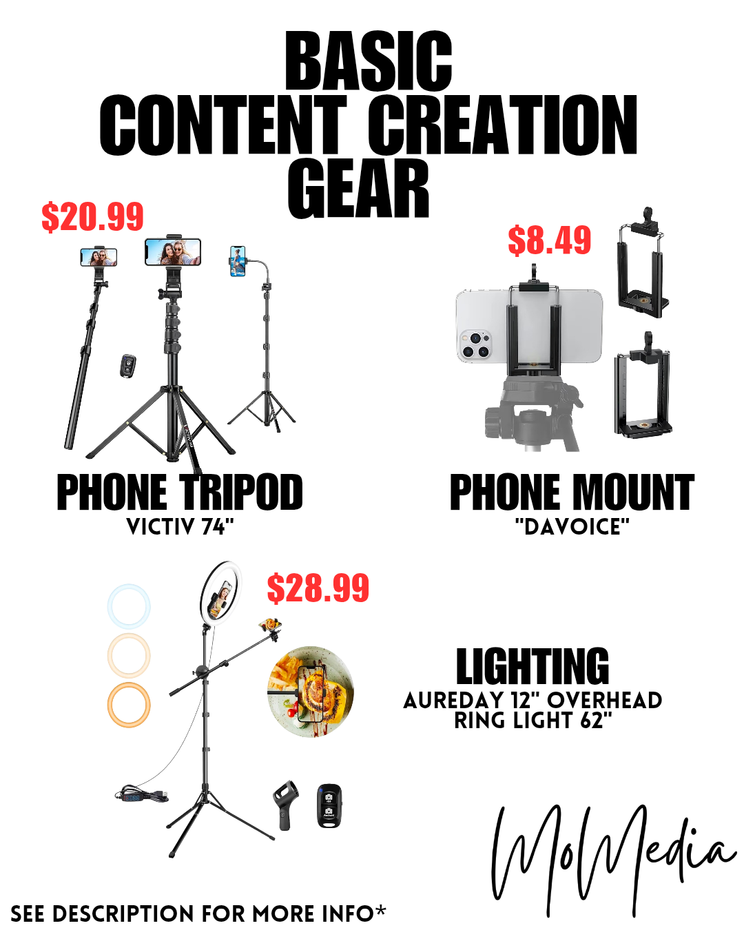 Ring Light: You just need white light. This does have a phone holder you can use if you dont have the budget for all 3 items, but I prefer to have my tripod for my phone seperate from my light.